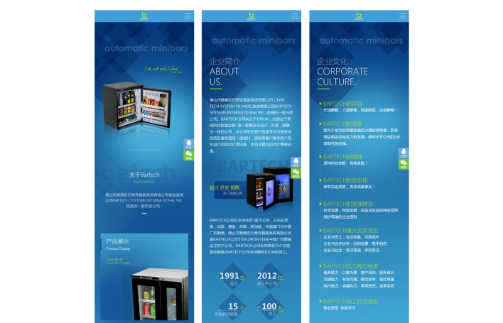 佛山市順德區巴蒂克智能系統有限公司(BARTECH SYSTEM SHUNDE)是由美國公司BARTECH SYSTEMS INTERNATIONAL INC. 投資的一家外資公司。BARTECH公司成立于1991年,總部位于美國的拉斯維加斯, 是一家集自主設計,開發,銷售為一體的公司,本公司的主營產品是專為世界各地的四五星級酒店,度假村,游輪等客戶要求而個性化設計的自動計費冰箱,手動冰箱與自動計費感應盒。