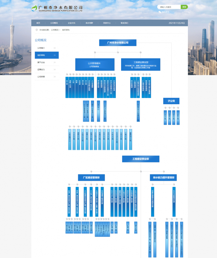 廣州市凈水有限公司是廣州市水務投資集團有限公司的全資子公司,創建于1989年,發展至今已成為一家集污水處理、建設、運營、資產經營及研發為一體的特大型國有污水處理企業。